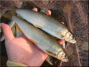 | 9/10那珂川「八溝大橋上」 | 天候 晴れ 仕事も忙しく、山へ行ったりもしておりましたので・・・久しぶりの鮎釣りです。気合を入れ午前8時過ぎたころから釣り開始!!いきなり25センチの本日最大級をゲット!囮にならず↓10時ころ3連荘があったほかポツポツ、午前中6匹ゲットしたところで昼飯とした。型は23〜24センチが半分これらは囮にならず、午後の囮がもつか心配である、午後開始20分子気味よい当り、珍しく15センチの可愛い鮎であった、これは囮にもってこいと思いきや・・・掛かりどころが悪く瀕死の状態。すでに鼻環をとおしていない囮はいない・・・しばし休憩をとることにした。30分ほど休み囮の回復を促し釣り再開、深瀞にて止め待つこと5分、きましたきました囮が!なんとか続けることができ、午後3時ころ4連荘を決め追いもなくなり納竿となりました。 今日の特徴は、掛かりだすと3〜4連荘・・・あとはポッツラポッツラの追いです。鮎が回遊しているような釣れ方です。はやくも終盤の模様!!