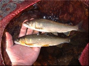 午前中,荒川へ 午前中10時から荒川で釣り開始12:30までに5匹釣り場所を移動することにする。 那珂川で釣りたい!午後は那珂川〜箒川へ 午後は那珂川八溝大橋上にはいるが青のろがひどく釣りにならず… またまた移動する,行くあてもなく旧那珂橋のうえから見るも〜やはり青のろ 仕方なく車を箒川の探索へ向ける294号の橋から左岸を上流に向け走り川を見る 浄法寺橋上の瀬が空いていたので入る3:00〜5:00まで釣り,同瀬にて7匹掛ける ビック&天然混じりだ (天然ものは15cmってところかなやっと囮に使えますが…さすが天然〜泳ぎは強い!) 最高20センチであった,合計12匹で納竿とする |
