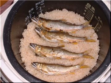 調理法<4人前>〜まず、米を3合研ぎます、 本日は昨夜炭焼きにした残り鮎4匹 (小ぶりのもの)を使います。 研いだ米にしょうゆ大さじ2杯・出汁1杯半 (つゆの素2倍希釈)を入れ、 規定の水量にし、上に塩焼きの鮎を並べます。 あとはスイッチONで炊き上がるのを待つだけね!! 写真は、スイッチを入れる前の状態です。